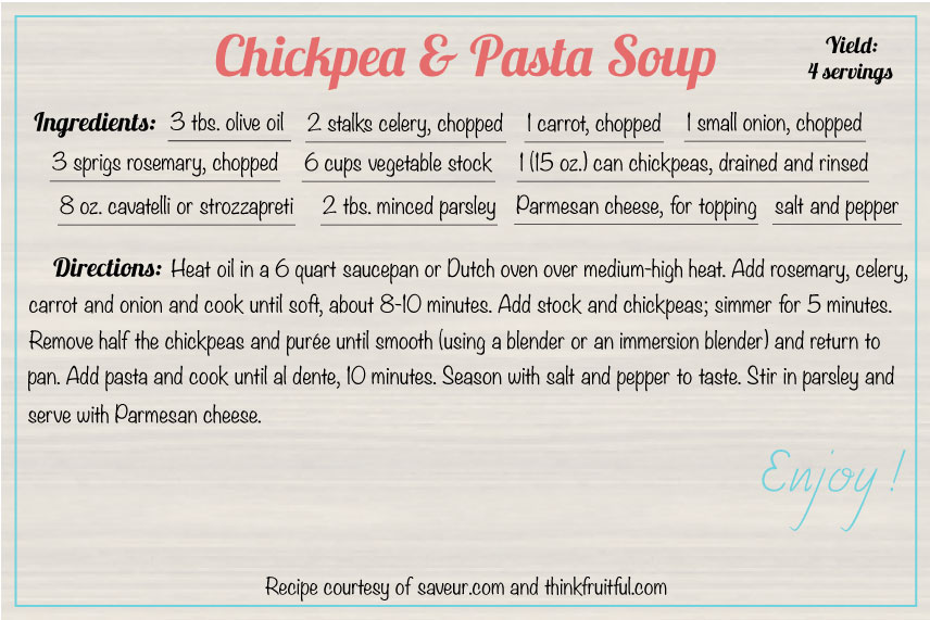 This is another soup that tastes so great when you start with a good homemade stock, and you can’t go wrong by adding pasta and chickpeas.